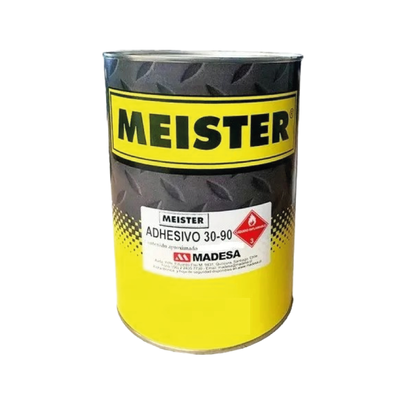 MEISTER 30 – 90 es un adhesivo a partir de policloroprenos y resinas sintéticas, disueltos en mezcla de solventes orgánicos, exento de Benceno y Tolueno. Resistente a la temperatura -30º C a +120º C.