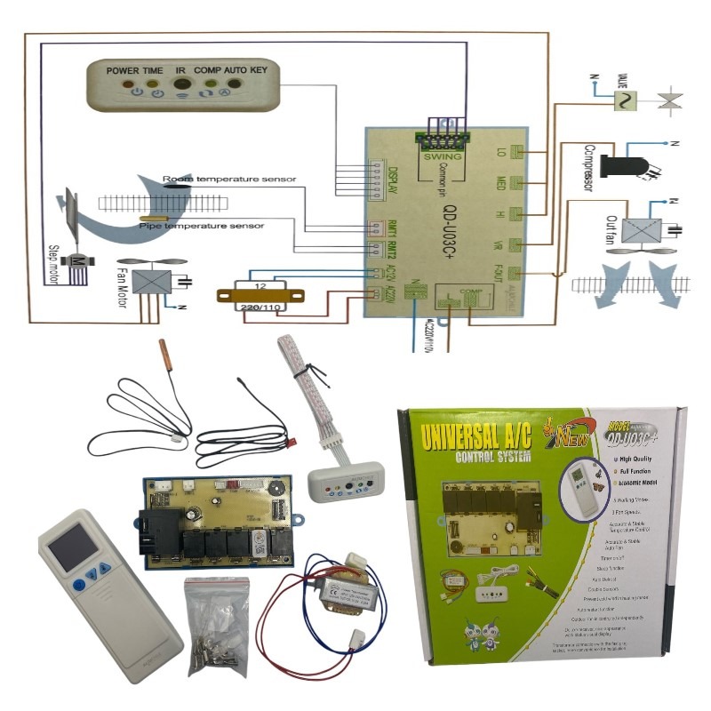 El Control Universal QD-U03C+ es una solución práctica, eficiente y económica para la reparación y reemplazo de tarjetas electrónicas en equipos de aire acondicionado tipo Split. Diseñado para brindar alta compatibilidad y fácil instalación, este sistema permite recuperar el funcionamiento del equipo sin necesidad de la placa original.
